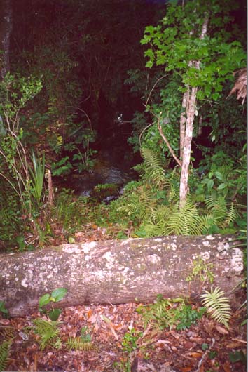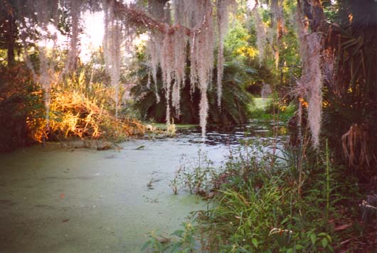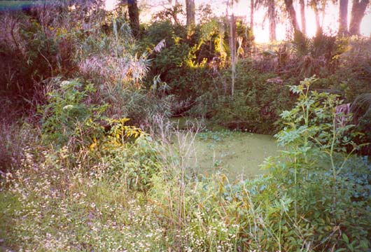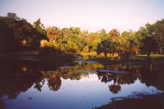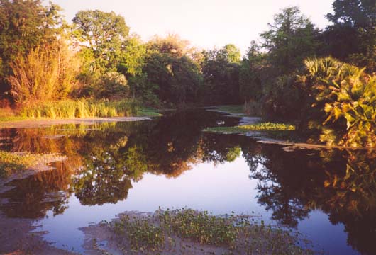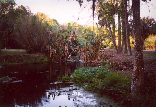 There is an island in the pond, the latter of which covers several acres. In the run shortly before it widens into the pond, there is another vent that creates a clear and large (10 feet in diameter) click on the surface. The depth of this vent could not be determined visually. Water flows powerfully over the weir in a waterfall and what appears to be the original spring run. This run is about 25 feet wide and several feet deep, and large fish were observed in the water. The banks of the run are heavily vegetated and sub-tropical. The run flows into Shady Brook, which flows into the southern tip of Lake Panasoffkee.