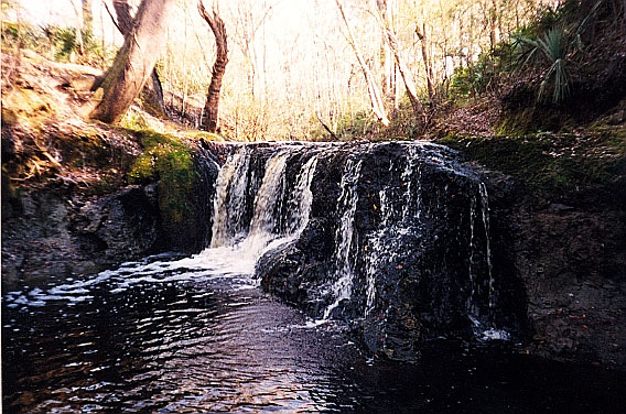 Right after the shoals, on the right bank, is a white sandy beach with a gentle slope. A few minutes more downstream and on your left, you see Robinson Creek emptying into the river, emerging from a ravine with steep banks. The water is dark, like the Suwannee. Follow the canopied creek in a few hundred feet - the river was so low that day that I walked it - and you will come across a waterfall not quite six feet high and fifteen feet across. Day-glo green moss grew everywhere on the rocks. Flat slabs of rock make a convenient places to walk in the shallow stream. Above the waterfall, the land levels out and the banks are not much higher than the creek.