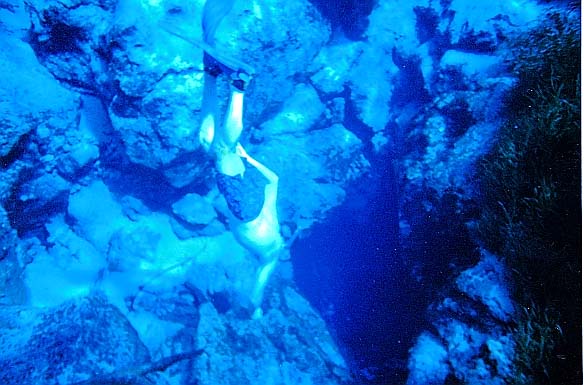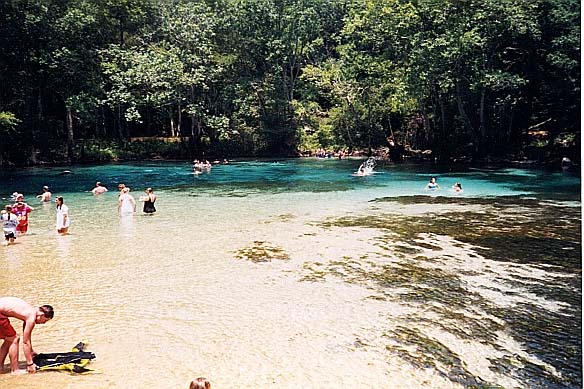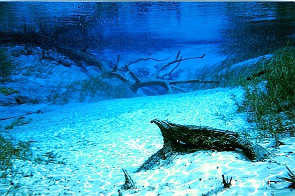 The second vent is located at the downstream edge of the spring pool, is about 10 feet deep, and issues from a smaller fissure about 15 feet long. Fallen cypress trees lie in the spring near the main vent. The bottom is strewn with large boulders and tree limbs and is rocky. When the authors visited the spring in the mid- and late 1990s, there were large sandy and underwater grassy areas in the spring pool.