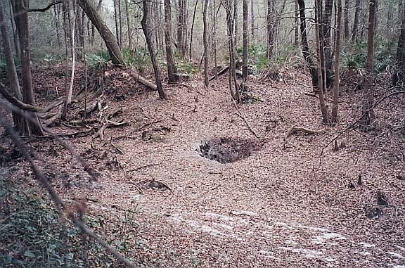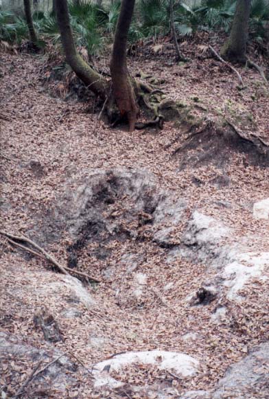 On date of visit, a time of historic drought (Feb. 2001), the Fenholloway River was dry and had been so for at least several months. (The riverbed was covered with leaves.) Two spots were found that are the most likely spring sites; one is a deep depression in the riverbed with a hole at the bottom, and the other a dry run into the riverbed. The pits in the riverbed might also be small sinkholes, another potential sign of a spring.