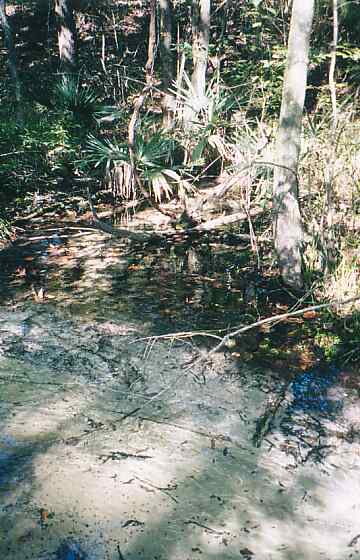 Two clusters of small springs lie at the head of connected spring runs that join to flow into the west bank of Econfina Creek about ¼ mile north of Williford Spring. The more westerly spring is in an area of thick forest and karst terrain and consists of three flows. Each flow is from the base of a limestone bank and from a small limestone cavity. Two springs flow from small cavities/grottoes at the head of the run. This area is roughly oval, about 10 feet in diameter, and opens directly into the run. The water is clear and only 2-3 inches deep, and the bottom is rocky and sandy. The third and smallest flow is about 40 feet from the head pool on the west side of the run. The first 200 feet of the run is very clear, from 10-15 feet wide, and the bottom is sandy. The lower part 250 feet of the run is often obstructed, is a few inches deeper, and is more muddy. After about 450 feet, the run is joined by the run from the more southern spring. This run is not navigable and must be waded except in times of high water.