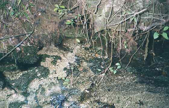 The southern spring is similar in appearance, also with three flows from small limestone openings/cavities/grottos. The bottom is rocky and sandy, and the clear water is only about 3 inches deep. The run from this fork is about 250 feet long, from 2-12 inches deep, and is much obstructed and barely navigable by canoe except in times of high water. Near the main spring is a cylindrical concrete structure roughly three feet in diameter and 5 feet high.
