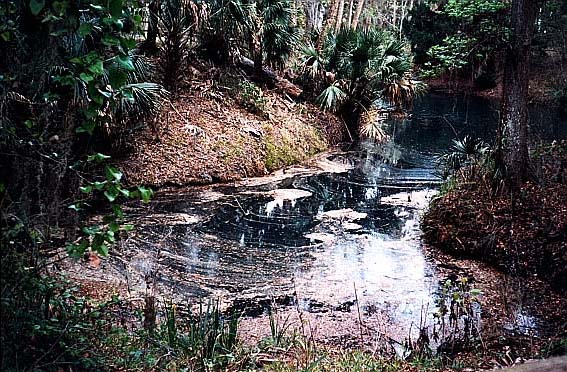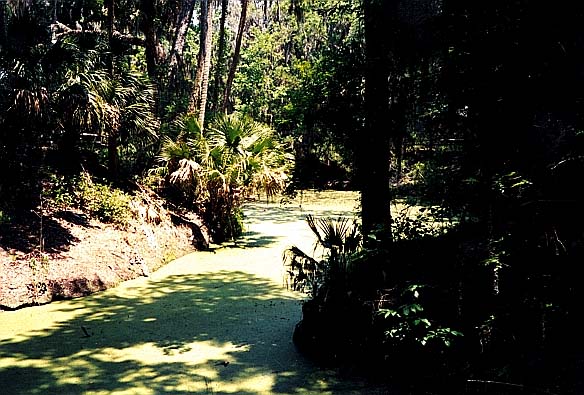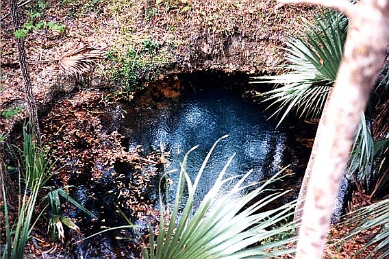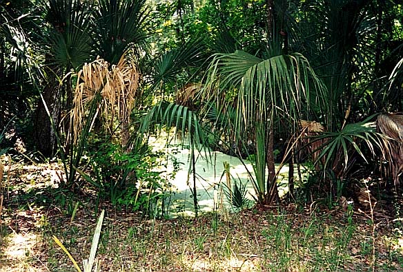 Gemini Springs consists of three springs within a short distance (about 120 feet) of each other on the north rim of Lake Monroe in SW Volusia County. The springs have similar characteristics--all form circular or semicircular pools at the base of banks (limestone, clay, and dirt) 6-10 feet high. Land continues to rise from the spring banks to the park's parking area. The pools range in diameter from 6-15 feet. All have clear and bluish if somewhat dark water, with brownish algae on the bottom and leaves or pollen-like material on the surface. The smallest spring has a strong boil, and the larger springs have mild slicks on the surface. The two larger springs appeared to be about 10 feet deep, but the depth of the small spring could not be determined visually. Land around the springs is lush and semitropical terrain of hardwoods and palmettos.