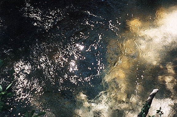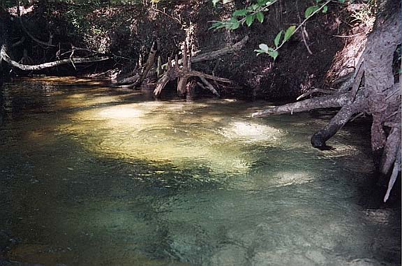 On date and time of visit—noon in late September 2001—the spring was illuminated by a shaft of light that gave it the appearance of being lit from within orbelow. This striking glow evoked a spotlight and made the otherwise small spring visible from over 100 feet away. There are several very large trees growing near the spring and providing a thick canopy, including cypress, pine, and magnolias.