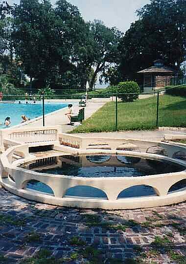 The spring is in a city park amid oak and palm trees on the westbank of the St. Johns River. The spring pool, about 20 feet in diameter at land surface, is bounded by a 2-ft.-high decorative concrete railing. The pool tapers downward in soft marl like an irregularly shaped funnel to a 2-ft. diameter cavern opening in its bottom, 31.5 feet below water surface. The 2-ft. opening then opens into a cavern 25 feet wide trending in a NE direction toward the St. Johns River. The roof of the cavern descends to a depth of 50 ft. and the bottom of the cavern falls to 150 feet. Some of the flow in this cavern is toward the St. Johns River, and it is possible that the spring does discharge water into the river bed. Most of the flow appears to emanate from the 2-ft. opening in the bottom of the pool. Discharge from the pool is through a 4-ft.-wide weir opening in the NE side to a 50-ft. by 100-ft. swimming pool. The swimming pool overflows through a weir on its east end to a spring run that is tributary to the St. Johns River about 300 ft. farther east. Some or all of the flow from the spring can be directed from a flume to bypass the swimming pool. The water is clean and clear and has a hydrogen sulfide odor (pp. 169-170).