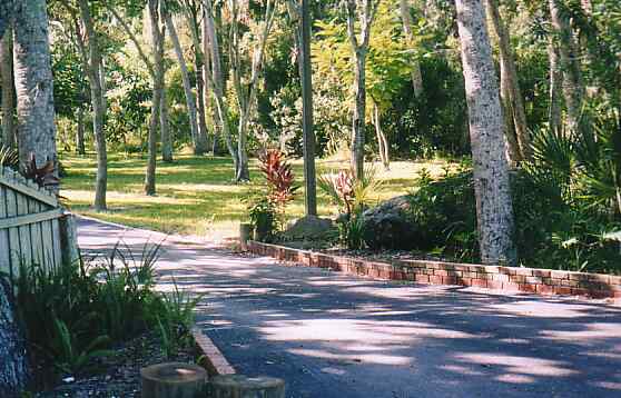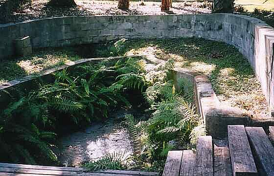 Concrete and stone steps lead down to the pool (between the two flow points) from the adjacent house and carport. There is a cinderblock retaining wall around most of the pool, built in the 1970s, which formerly had a wier/dam mechanism to raise the level of the spring pool. The dam is now gone and the water flows naturally into its original run. Near the spring, the run is 2-6 feet across and lushly vegetated with native and cultivated plants, including banana trees. The run flows a short distance through a nearby condominum complex and thence into a lake that connects into the intracoastal waterway and the Gulf of Mexico. Land rises gradually to the east and north of the pool, forming a little ridge near Hamlin Road. There are oak and citrus trees in the yard near the pool.