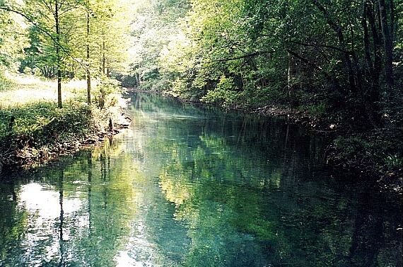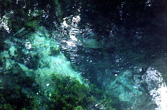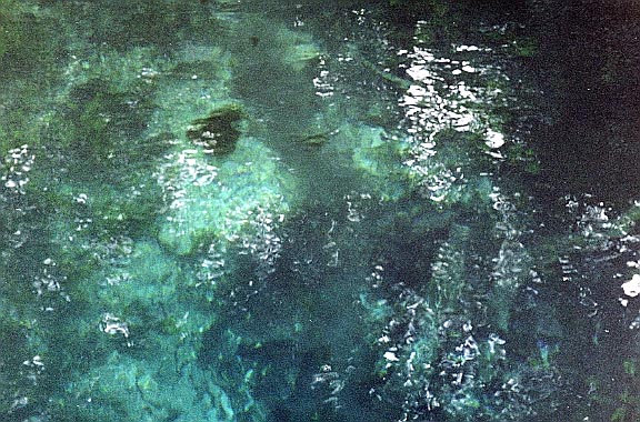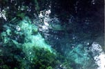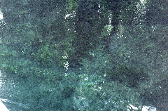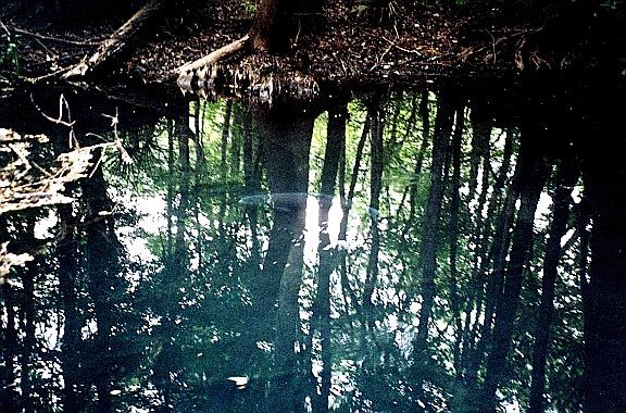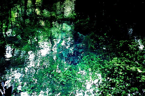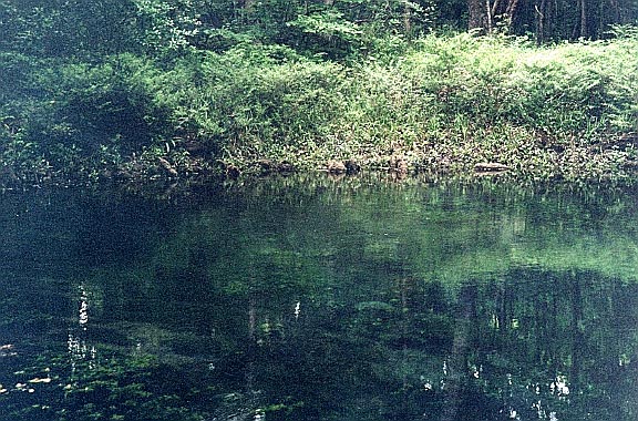 The third vent is about 300 feet downstream of the head of the run. It is limestone opening at a depth of about 10 feet is and 3 x 5 feet in diameter. It issues clear blue water that is a contrast to the green vegetation around it, and creates a good boil on the surface. There is a large cypress stump on the bank nearby.