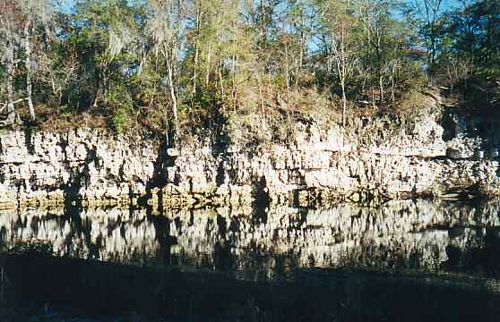 When visited in fall 1999—a time of prolonged dry weather and low water level in the Suwannee River, the spring was dry. When flowing, it is a small upwelling from exposed limestone in a grotto with a short run to the Suwannee River. The water has a sulfurous odor..