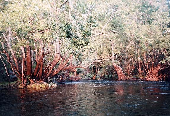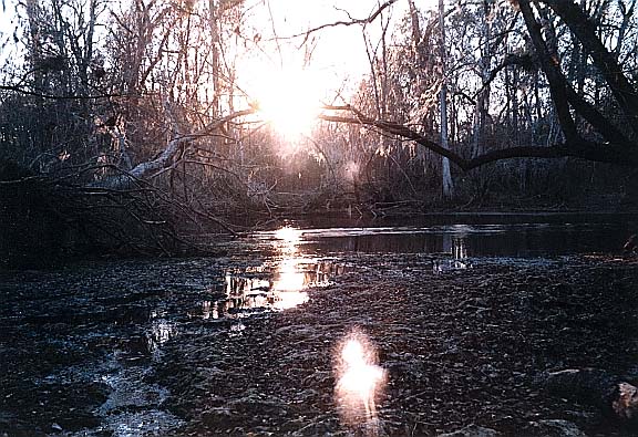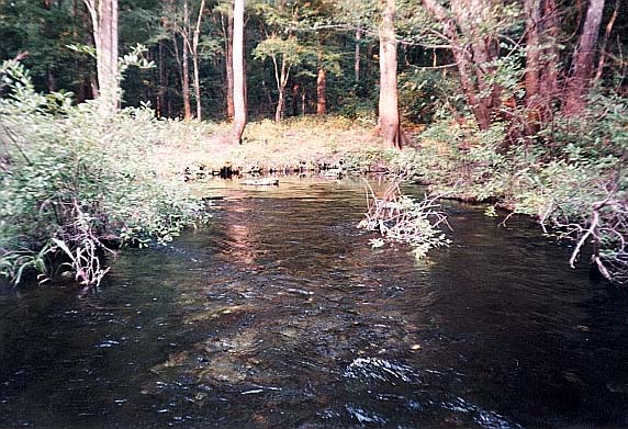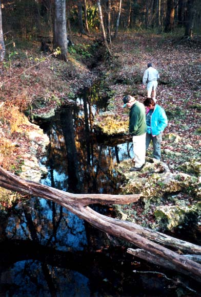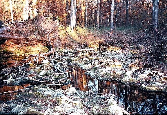 Visible from the river, Myrtle's Fissure is about 120 feet from the Santa Fe and creates a shallow run that flows across rough and somewhat jagged limestone. Boulders lie in the run and along its edges. The spring is a long (about 75 feet) fissure that is only about 4 feet wide at its widest point and tapered at the ends. The fissure is against the bank, parallel to the river, and is widest and deepest near the downstream end. According to DeLoach (1997, p. 93) the fissure is at least 60 feet deep. Water flowing from the fissure is clear, but appears dark in the crack itself. Land around the spring is dense floodplain forest. When visited in June 2002, the water was clearer and a limestone wall was visible descending from the surface more than 20feet.Use/Access
