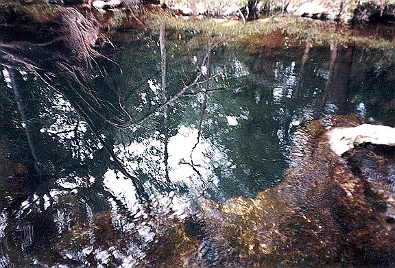 With its powerful and sometimes noisy run, dark waters, and edges extending beyond your line of vision, Myrtle's Fissure is visually striking. Robert Frost's description of a snowbound forest also seem appropriate for this spring, which has waters that are "lovely, dark, and deep."
