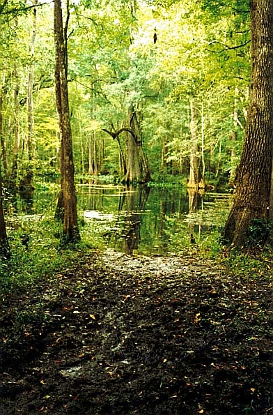 The springs are canopied by hardwood, floodplain forest. The spring run--about 3 feet deep--flows west from the springs approximately 300 feet to where it joins the run from Blue Springs under the Blue Springs Campground boardwalk.