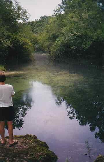 Ruth Spring forms a tear-drop-shaped pool that is about 50 feet in diameter. Water in the spring is clear and has had a greenish tint on the dates that the authors have visited. The depth of the pool varies with the level of the Suwannee River, but is generally shallow enough for wading. The water is deepest over the small vent, which is 5-10 feet deep depending of the level of the Suwannee. There is a mild boil over the vent, which is near a wooden wall that erected next to the limestone wall around the parking-lot end of the pool to prevent erosion. Small fish congregate in the pool. The spring forms a meandering, shallow run of about ¼ mileto the Suwannee. There is little vegetation in the spring pool or its run. Oak, gum, and cypress trees form a canopy over the pool and its run.