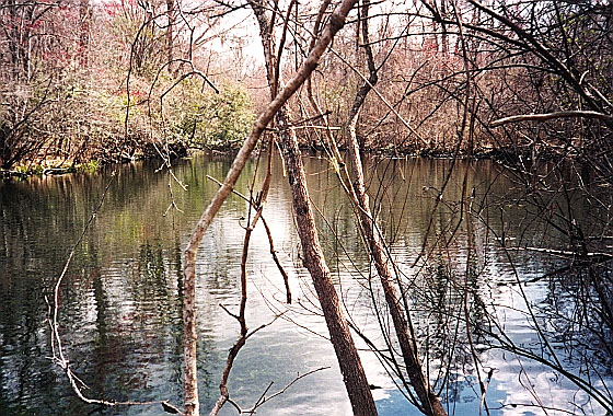 The spring pool area is bordered by swamp on two sides and joined by the flow from nearby Indian Springs. The oblong pool area is perhaps 30 feet across and forms a run that flows for more than half a mile into the Wakulla River. According to Rosenau et al. (1977, p. 416) the spring discharges from a shelf under the road that leads to a cave of unknown depth and distance. The water can be choked with exotic vegetation. Alligators are sometimes seen in the spring, the clarity of which varies from clear blue to murky.