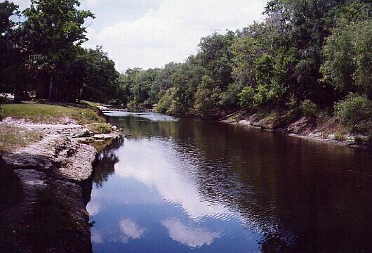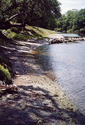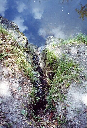 A short distance downstream in the Peace River--perhaps 1,000 feet south of the original spring--there are numerous drips and seeps on the east side of the river and on both sides of the boat ramp. The more northerly seeps are from 3-4 cracks in the limestone back and trickle into the river. The cracks appear to have been worn into the limestone by the flow, are a few inches wide, and extend up the bank which was 5 feet high on date of visit in April 2002. This portion of the bank is on the river side of a peninsula perhaps 400 feet long and 75 feet wide. A pool created by the peninsula to the east of the river abuts the campground at the park. It is possible that these little flows are merely river water seeping through the narrow peninsula into the river.